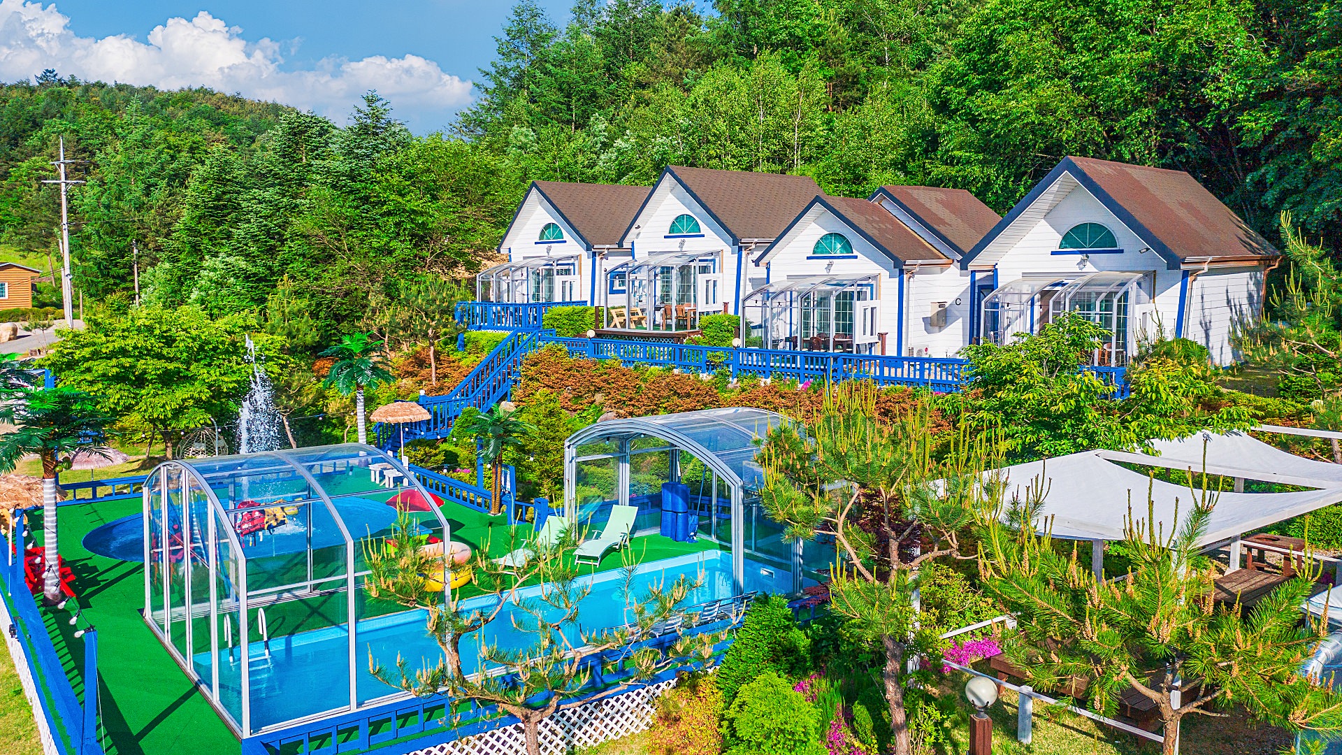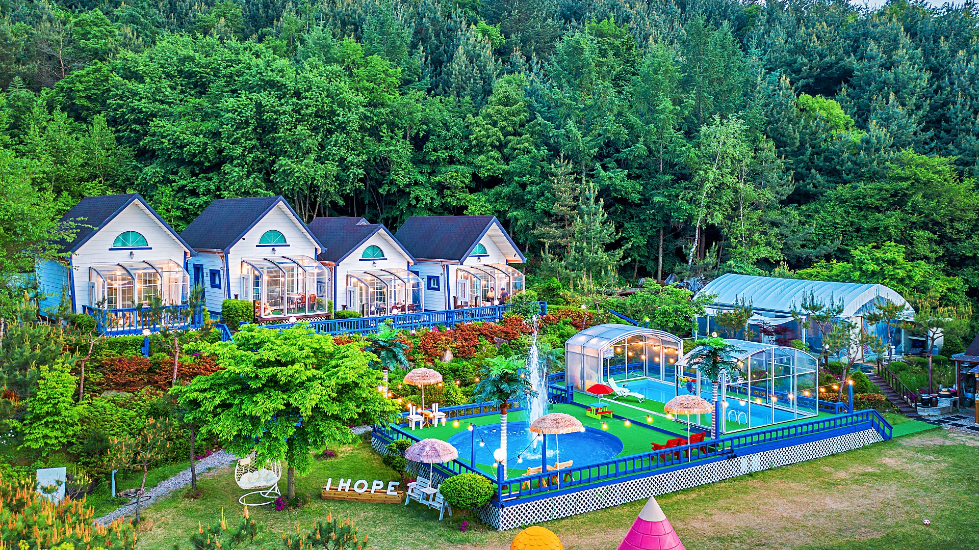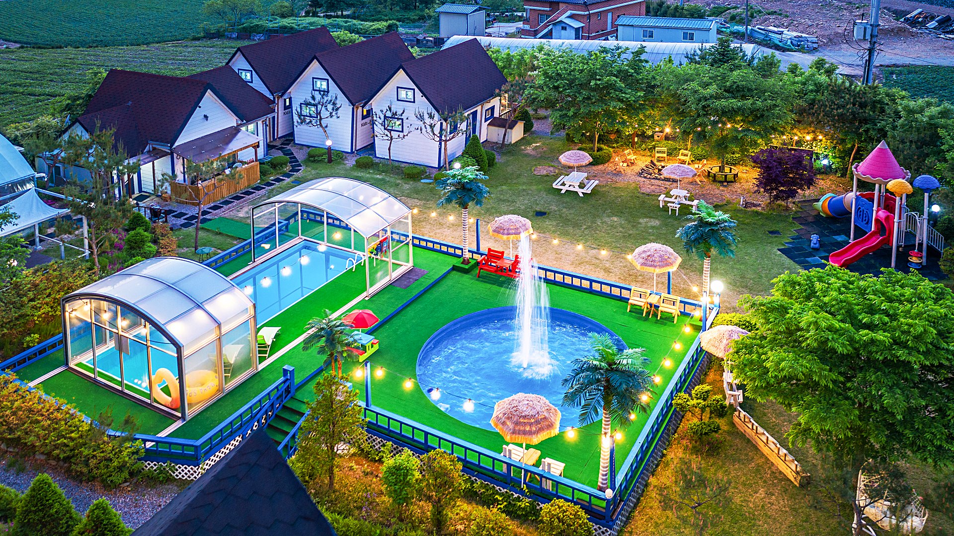 4계절 이용할 수 있는 돔 수영장과 객실에서 즐기는 개별바비큐장,