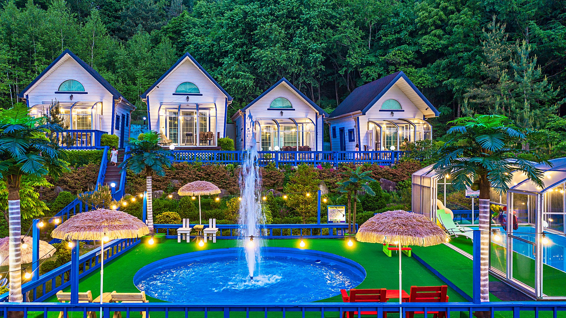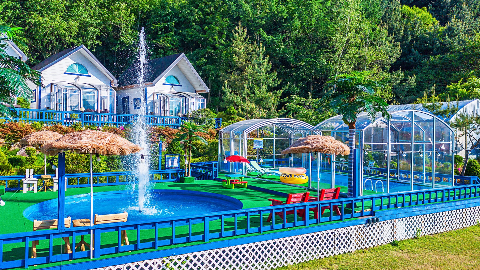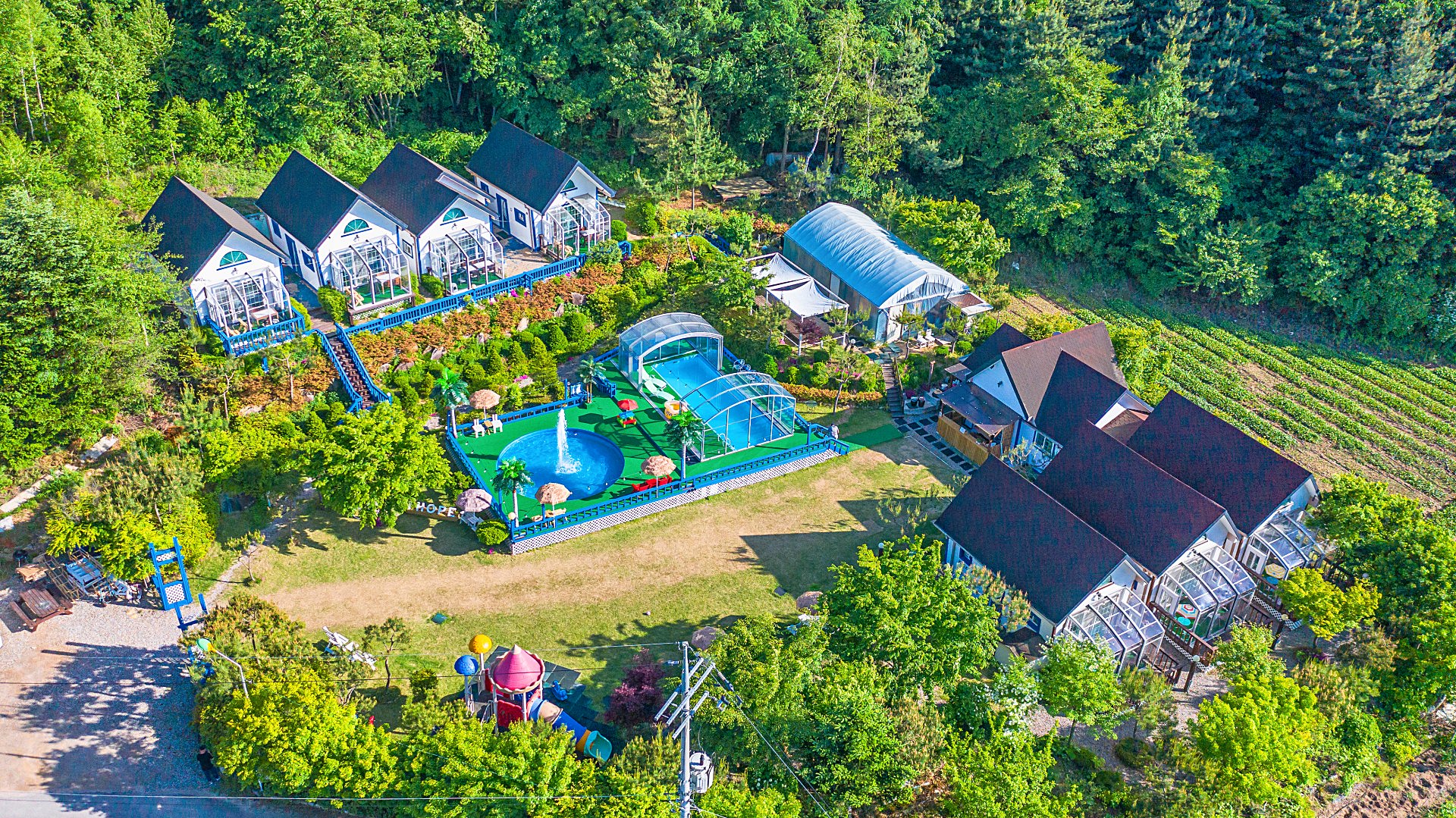 4계절 이용할 수 있는 돔 수영장과 객실에서 즐기는 개별바비큐장,